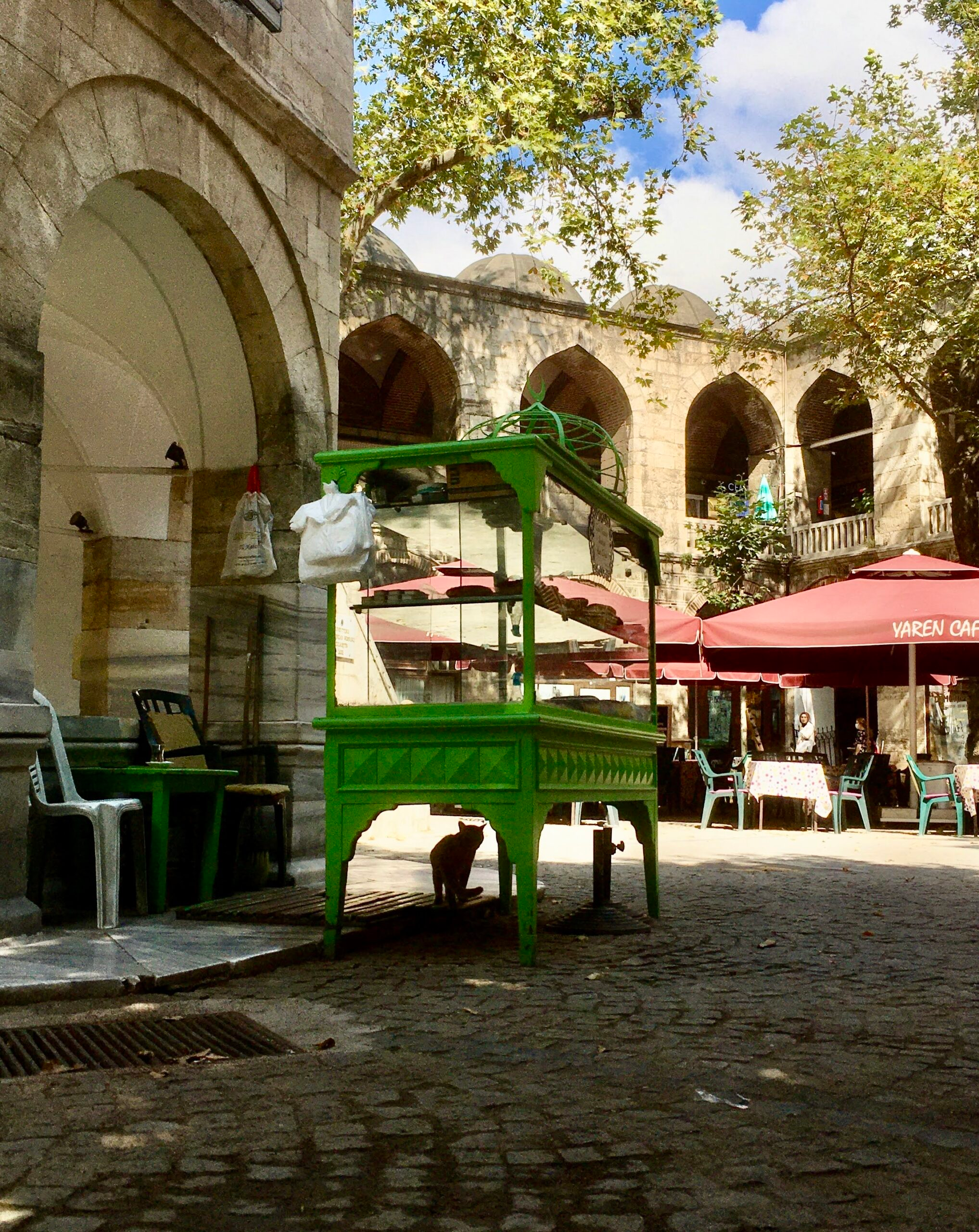Besides, it is a very popular place for people to come and relax, sipping Turkish coffee or tea in the courtyard. You can also accompany your beverage with some delicious simit or tahinli pide from the green cart.