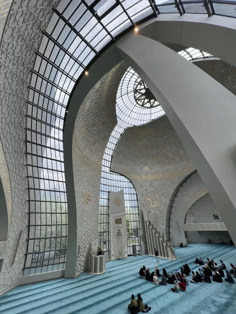 Designed by the German architect Paul Böhm, the mosque features stunning glass windows the length of the mosque and two high minarets. It is a stark contrast with the traditional Gothic and Romanesque landscape of the city. From far away, you can see that the windows form the word “Allah” in Arabic.