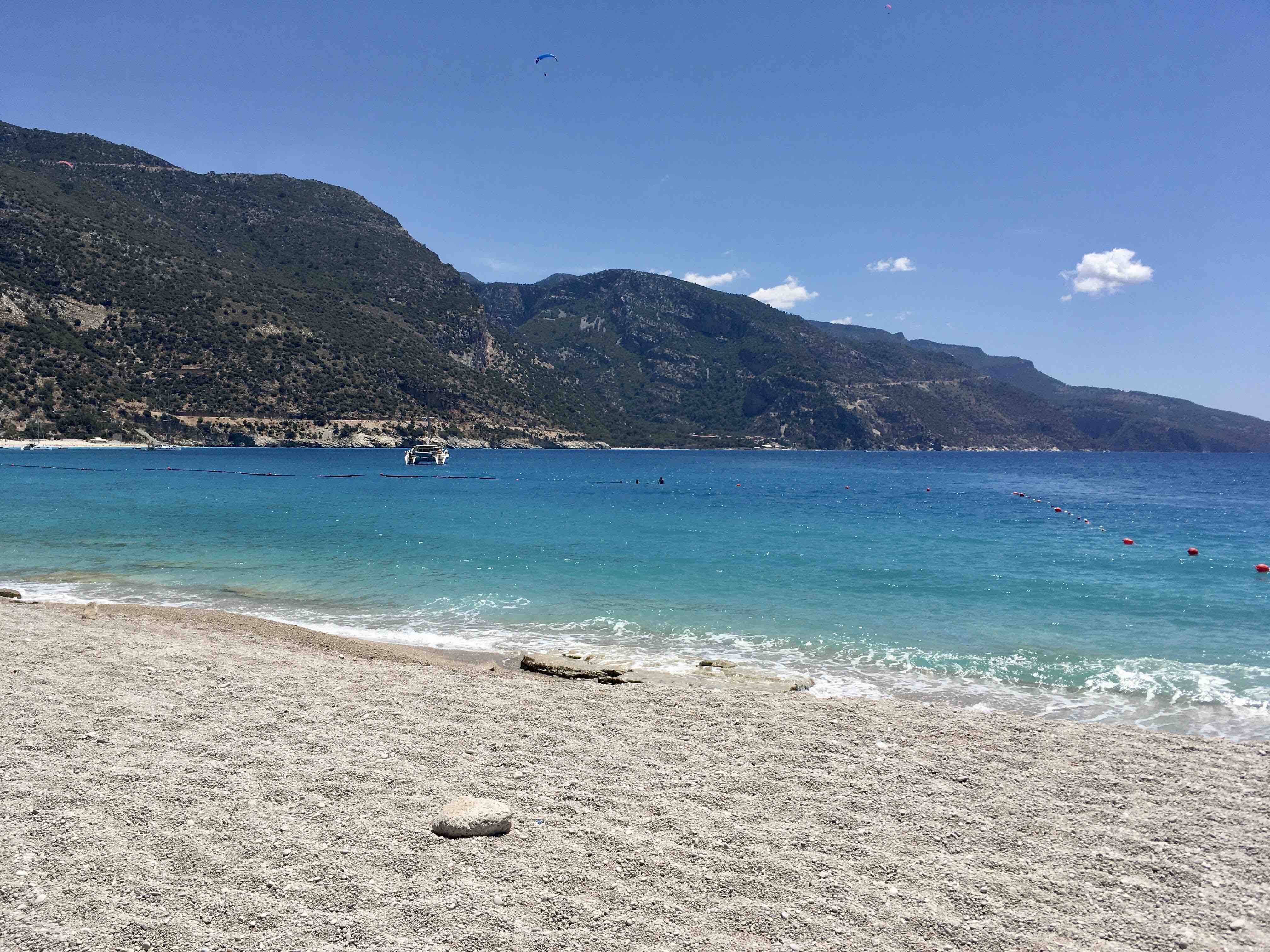 Ölüdeniz is a highly popular beach resort near Fethiye. The town is famous for its turquoise waters, paragliding and boat trips to nearby coves and islands. The beach itself is a long strip of tiny white pebbles.