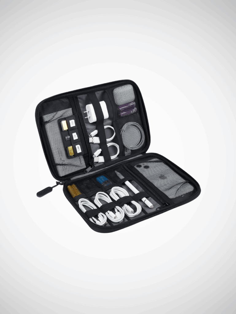 If you work while you travel or use a lot of tech, then this comes in handy. It keeps your cables, chargers, SD cards, earbuds, and power bank in one place.