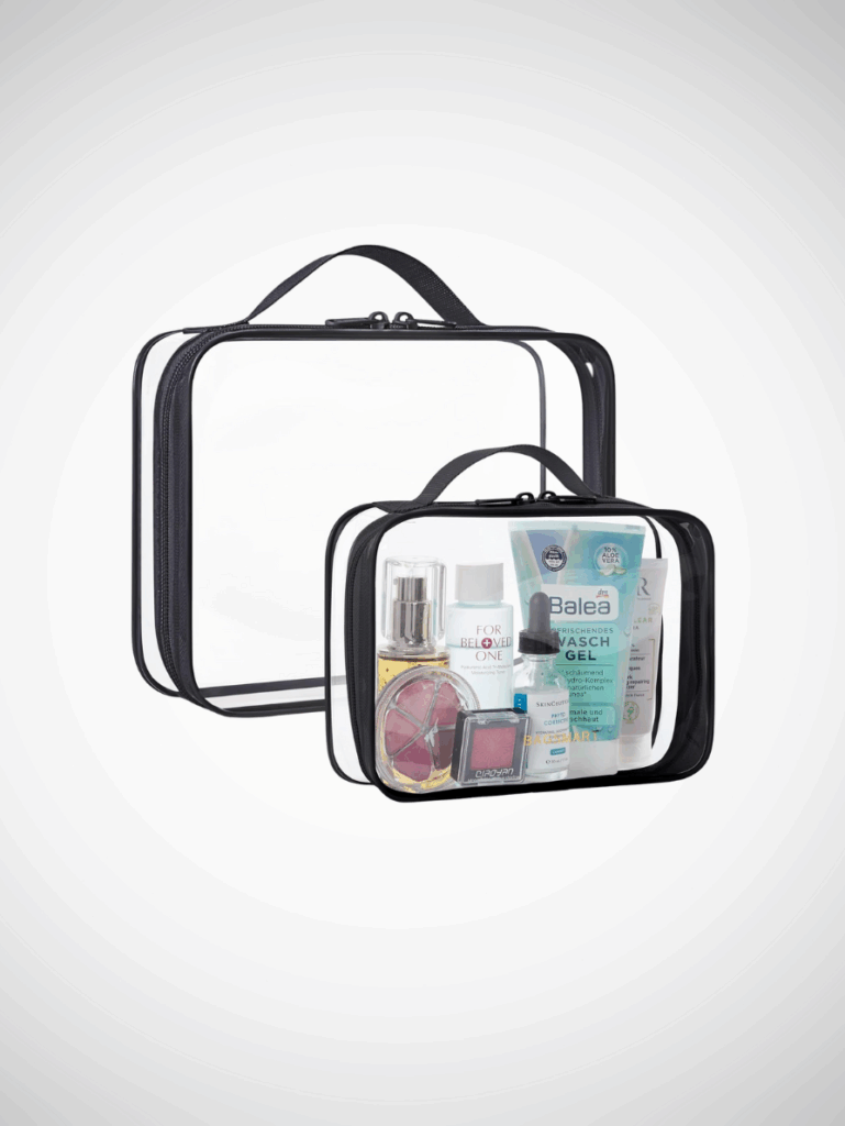 A simple toiletry bag helps keep everything accessible in hotel bathrooms and during airport checks. Choose one with compartments to separate skincare, haircare, and basics. I bought so many toiletry bags over the years, including the one with a hook, only to never have a place to hang them.